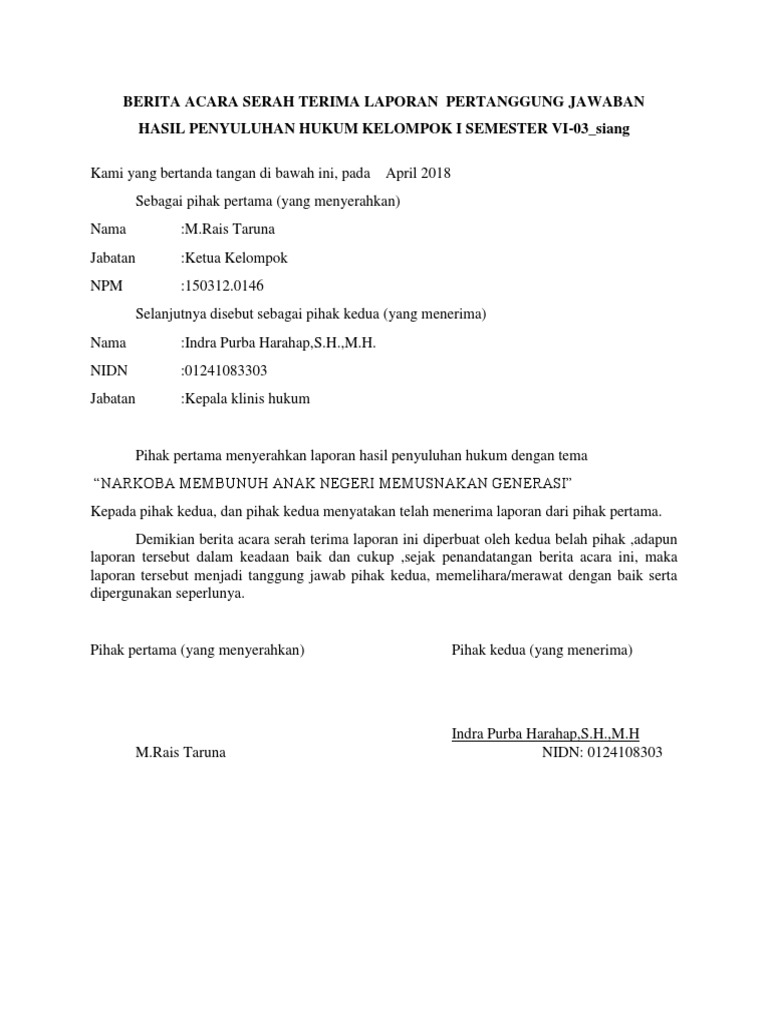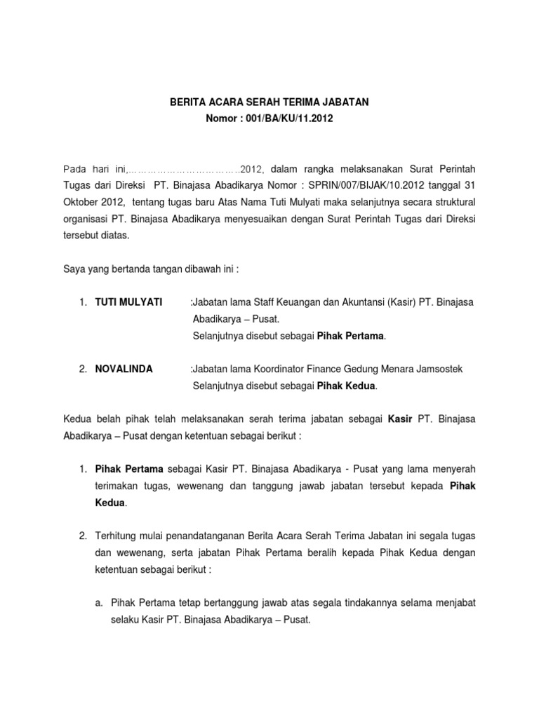 Contoh Berita Acara Audit Keuangan Contoh Surat from imgv2-2-f.scribdassets.com Contoh berita acara serah terima barang berita acara serah terima barang adalah salah satu dokumen penyerahan barang yang sangat penting. Adalah dokumen tertulis yang disusun dengan tujuan memberikan laporan pelaksanaan Surat ini sebaiknya segera di bubuhkan dengan tanda tangan saat prosesi penyerahan suatu barang dari satu pihak kepada pihak yang lainnya. Jika surat lebih dari 1 halaman, kepala surat hanya digunakan pada halaman pertama. Klasifikasi rincian lengkap kode surat dinas kode surat dinas berdasarkan surat edaran dinas penduidikan dan kebudayaan kabupaten magelang no. Menyusun laporan keuangan sekolah 10. Surat perintah mulai kerja (spmk) permen pu no. Untuk surat menteri keuangan atau pejabat eselon i atas nama menteri keuangan digunakan kepala surat berupa lambang negara dan nama jabatan.