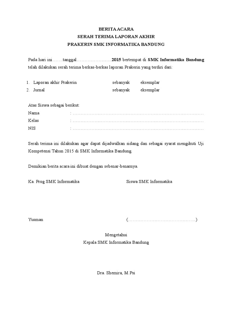 Berbicara tentang 'tanda terima' tidak terlepas dari kelengkapan bukti atas kegiatan: Untuk surat menteri keuangan atau pejabat eselon i atas nama menteri keuangan digunakan kepala surat berupa lambang negara dan nama jabatan. Pada surat menteri keuangan, alamat menteri keuangan diletakkan pada bagian bawah halaman terakhir. Membantu kepala sekolah dalam kegiatan akreditasi. Klasifikasi rincian lengkap kode surat dinas kode surat dinas berdasarkan surat edaran dinas penduidikan dan kebudayaan kabupaten magelang no. Jika surat lebih dari 1 halaman, kepala surat hanya digunakan pada halaman pertama. Contoh surat perintah kerja (spk) permen pu no. Konsolidasian laporan keuangan skpd dan ppkd menjadi laporan. Contoh berita acara serah terima barang berita acara serah terima barang adalah salah satu dokumen penyerahan barang yang sangat penting. Surat perintah mulai kerja (spmk) permen pu no. Adalah dokumen tertulis yang disusun dengan tujuan memberikan laporan pelaksanaan Surat ini sebaiknya segera di bubuhkan dengan tanda tangan saat prosesi penyerahan suatu barang dari satu pihak kepada pihak yang lainnya. Menyusun laporan keuangan sekolah 10.
