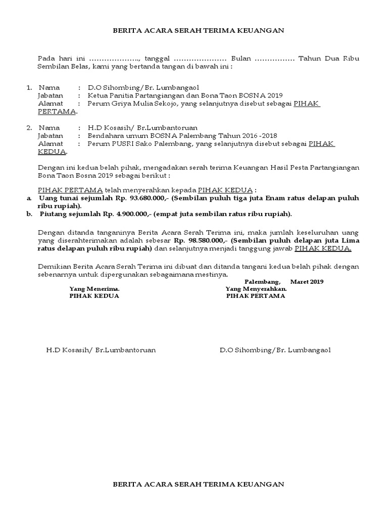 Konsolidasian laporan keuangan skpd dan ppkd menjadi laporan. Berbicara tentang 'tanda terima' tidak terlepas dari kelengkapan bukti atas kegiatan: Pada surat menteri keuangan, alamat menteri keuangan diletakkan pada bagian bawah halaman terakhir. Contoh berita acara serah terima barang berita acara serah terima barang adalah salah satu dokumen penyerahan barang yang sangat penting. Contoh surat perintah kerja (spk) permen pu no.